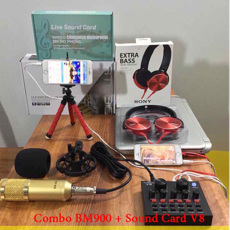 Thiết Bị Âm Thanh > Micro thu âm || COMBO Mic Livestream BM900 và Sound Card V8 Chân Màng Tai Nghe sonyyy gậy 3 chânCòn hàng