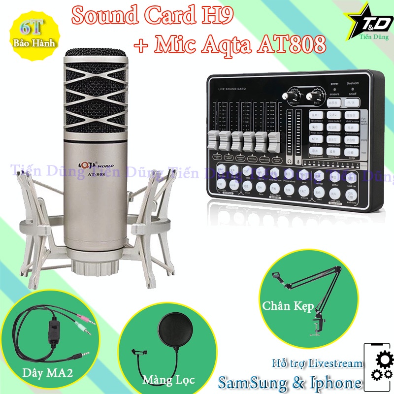 Combo mic livestream karaoke Aqta AT808 và sound card H9 có bluetooth Auto-tune đi kèm dây ma2 chân kẹp màng lọc