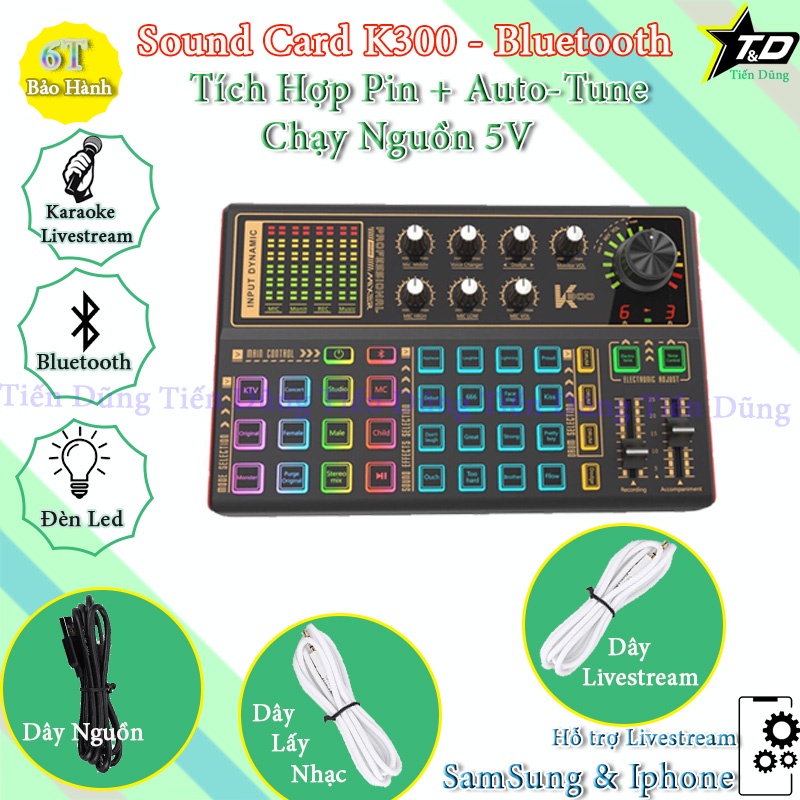 - Sound card livestream K300 là chiếc Sound Card mạnh mẽ trong phân khúc được thiết kế tinh tế theo hơi hướng hiện đại cùng với đó là chất liệu nhựa cao cấp ABS điều chỉnh các phím được phân bố phù hợp, cùng với đó K300 tích hợp hệ thống đèn led LGB với nhiều màu sắc bắt mắt tạo điểm đặc biệt sản phẩm.Tùy chỉnh âm sắc từng cổng micro, nhạc cụ riêng biệt, hát trực tiếp bằng micro trên tai nghe điện thoại phổ thông, chế độ Auto-Tune hát hay hơn với nhiều tùy chỉnh tông nhạc theo bài hát.