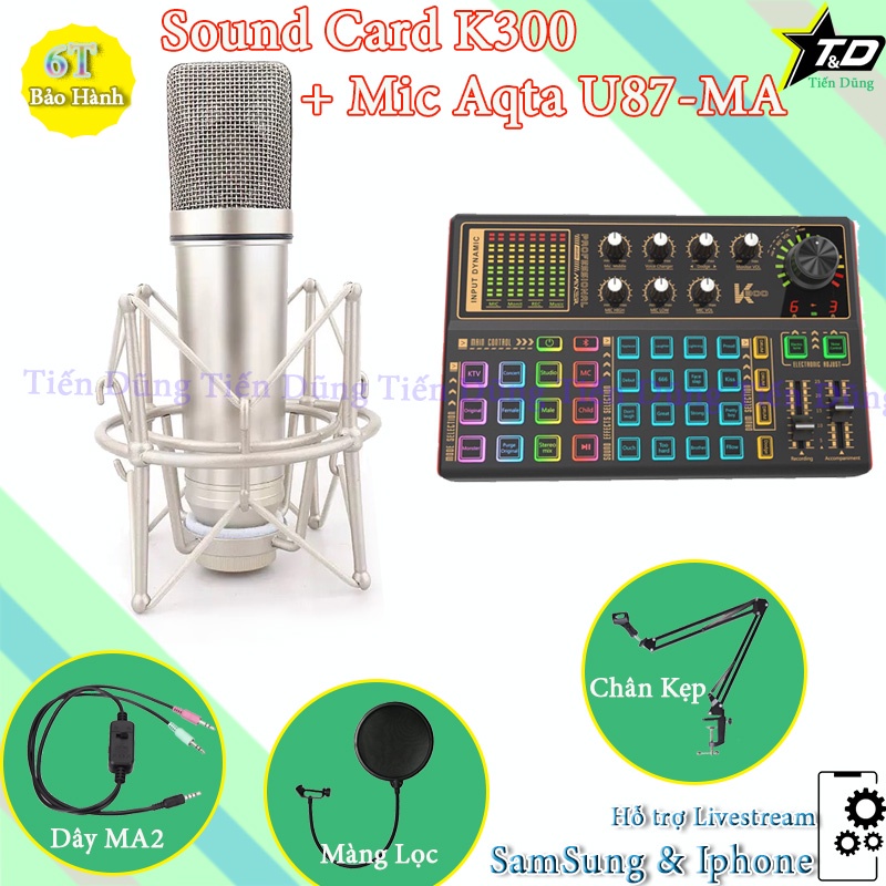 Combo mic livestream karaoke U87 MA và sound card K300 có bluetooth Auto-tune đèn led đi kèm dây ma2 chân kẹp màng lọc