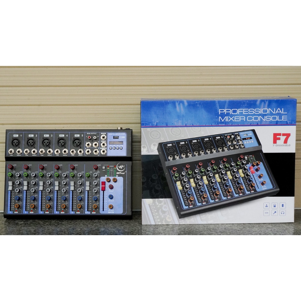 Mixer MTMax F7 BT là dòng sản phẩm mới ra mắt của thương hiệu âm thanh MTMax, sử dụng chủ yếu trong gia đình hoặc hội trường. Sản phẩm cải tiến của F4 USB với 10 đầu vào. Cho khả năng trộn âm từ nhiều thiết bị hơn.