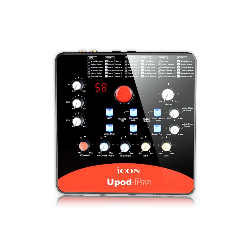 + Chỉnh điều khiến Trên bề mặt icon upod pro được thiết kế 12 phím cứng với giao diện hoàn toàn bằng tiếng anh vừa hiện đại vừa điều chỉnh âm thanh dễ dàng. Bạn có thể tùy chỉnh âm lượng micro, âm lượng tai nghe, loa kiểm âm hay các âm bass, mid, treble,...
