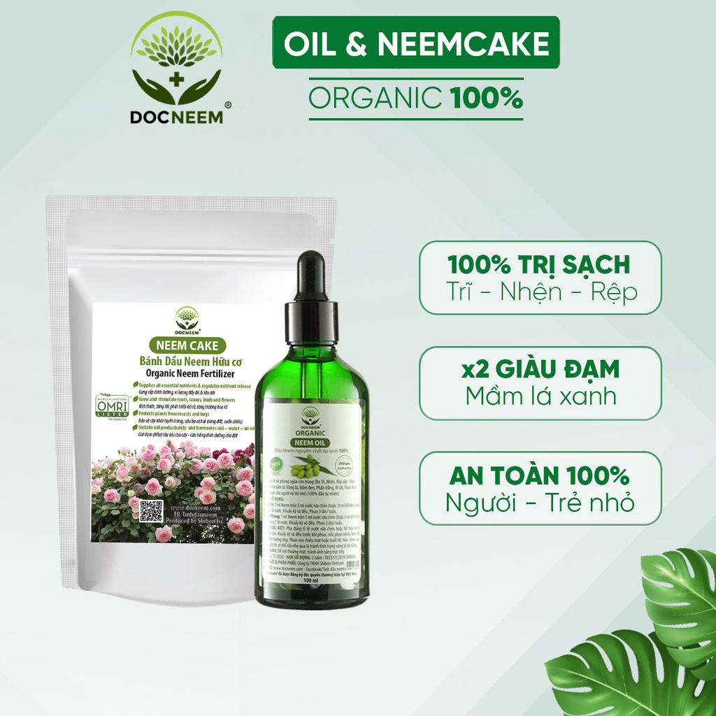 Nhà cửa & Đời sống > Làm vườn > Phân bón || Combo Neem oil và Neem cake hữu cơ DOCNEEM trị sâu bệnh, sùng đất cuốn chiếu, kích rễ hoa hồng chai 100ml và túi 1kgCòn hàng