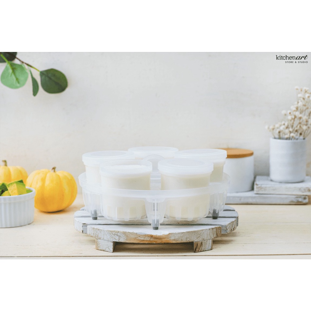 Bộ sản phẩm có thể làm được 5 cốc sữa chua (mỗi cốc 5oz/150ml). Để làm sữa chua, đổ 3 cup nước vào lòng nồi. Đặt giá, và xếp các cốc đã chứa sẵn men và sữa được tiệt trùng lên. Hãy chắc chắn rằng mực nước ngập một phần các cốc.