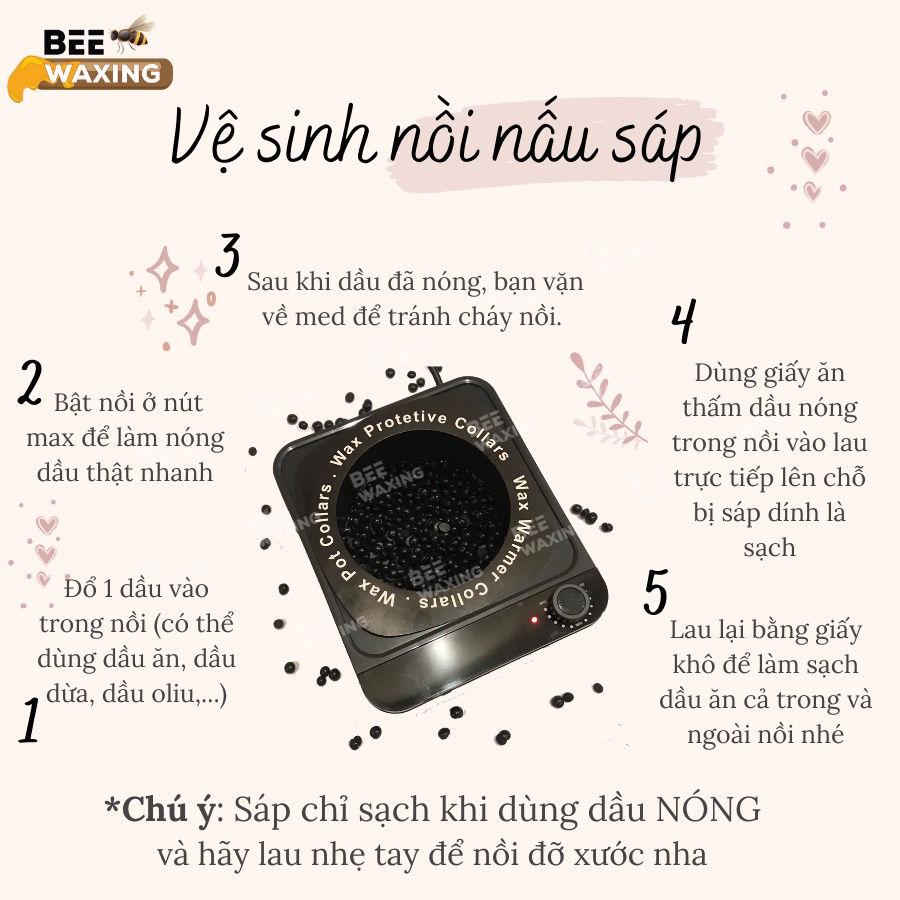 Nồi nấu sáp Bee Waxing siêu chống dính có khả năng làm tan chảy sáp siêu nhanh chỉ trong vòng 1-3 phút và 100gr sáp wax với cách sử dụng vô cùng đơn giản: