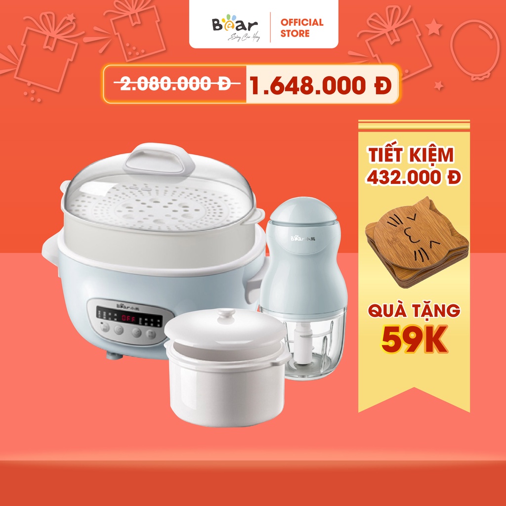 Thiết Bị Điện Gia Dụng > Đồ gia dụng nhà bếp > Nồi nấu chậm & Dụng cụ nấu chân không || Combo Nồi Nấu Chậm 2,5L Bear SUBE003 và Máy Xay Ăn Dặm 0,3L Bear B03V2 nấu cháo, chưng yến Bảo hành Chính hãngCòn hàng