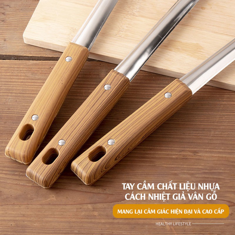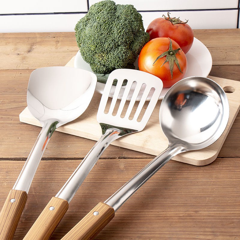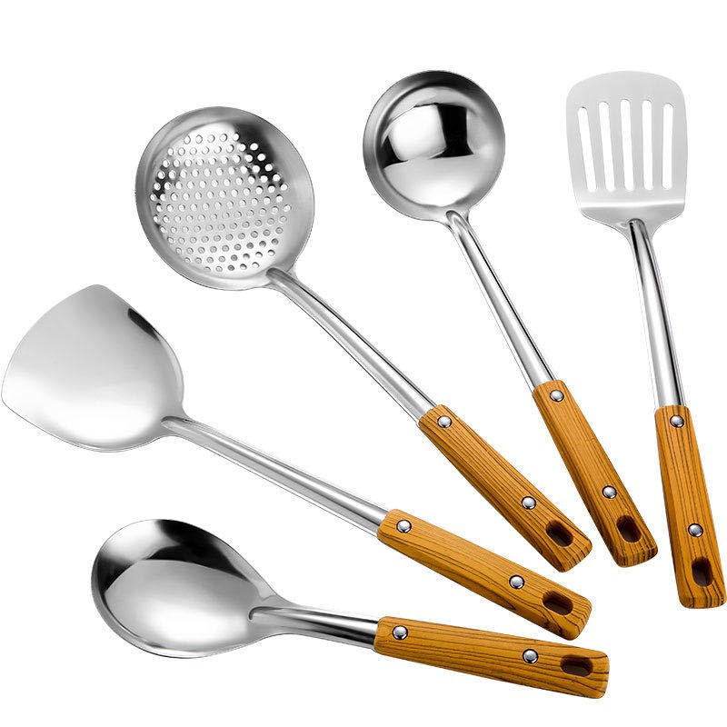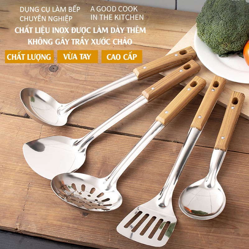 Combo Set 5 Món Xẻng Muôi Múc Cơm Canh Cán Ốp Gỗ Inox 304 Cao Cấp