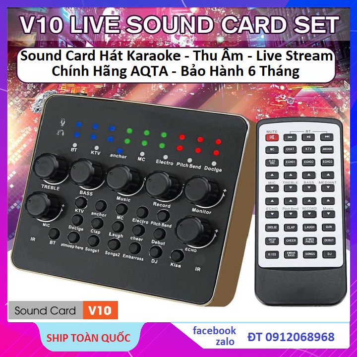- Sound card v10 là một dòng sound card chuyên dùng để thu âm, hát karaoke giải trí, hát livestream trên các trang mạng xã hội: Facebook, youtube, bigo… Mặc dù mới có mặt trên thị trường một thời gian nhưng sound card v10 đã được rất nhiều các tín đồ yêu âm nhạc ở trên toàn quốc tin dùng.- Cũng như những dòng sound card thu âm chuyên dụng khác, sound card v10 cũng có các nút chỉnh bass (làm ấm giọng), treble (làm sáng giọng), echo (thêm vang cho giọng) và các nút điều chỉnh âm lượng micro, âm lượng nhạc beat, âm lượng tai nghe.
