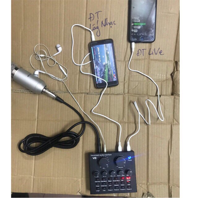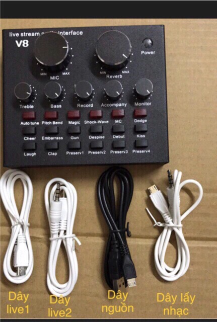 Combo giá siêu tốt bộ combo sound v8 và mic bm800 đủ bộ để live và ghi âm1. Soundcard V8 bao gồm dây nguồn 2 dây live (2 điện thoại). 1 dây livestream