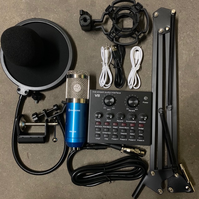 Giới thiệu Combo thu âm livestream Mic BM900 zansong và sound card V8 chân kẹp+màng lọc đầy đủ bh
