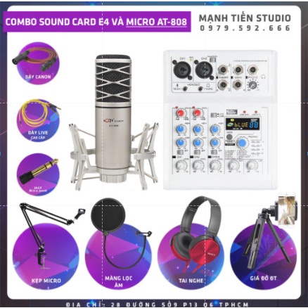 Combo thu âm, livestream Micro AQTA AT-808, Mixer E4 - Kèm full phụ kiện kẹp micro, màng lọc, tai nghe, dây live chế....