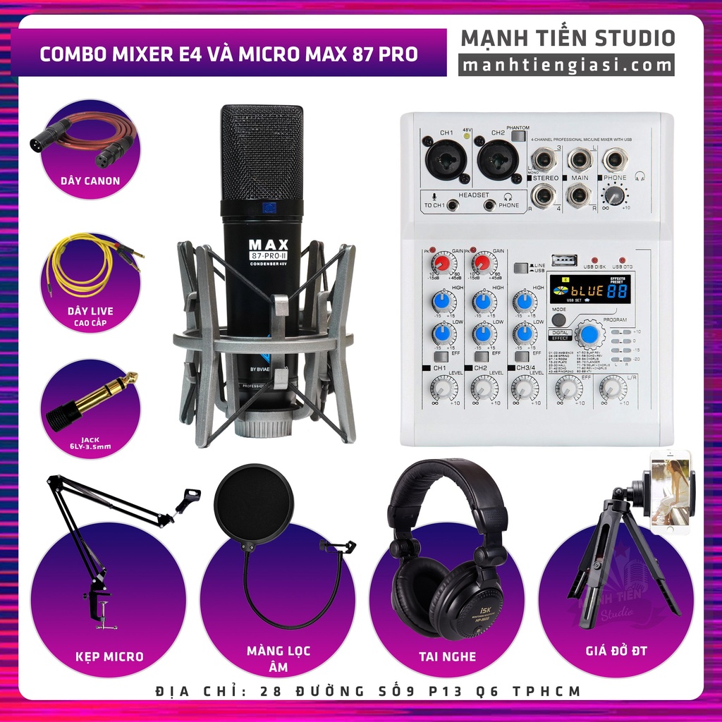 Thiết Bị Âm Thanh > Micro thu âm || Combo thu âm Mixer E4 Và Micro Max 87-Pro-II đen livestream karaoke bán hàng onl tiktok đủ phụ kiện tặng kèm bh 12tCòn hàng