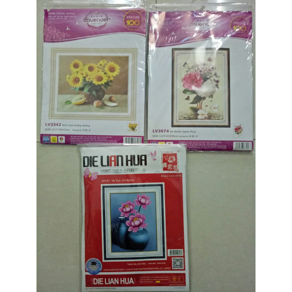 Sản phẩm bao gồm: vải in sẵn các kí hiệu màu sắc rõ ràng dễ nhìn dễ thêu, tờ hướng dẫn (chart), chỉ thêu, kim…