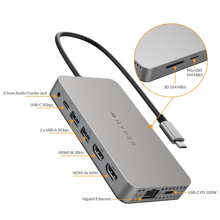 Máy tính & Laptop > Phụ Kiện Máy Tính > Bộ chia cổng USB & Đọc thẻ nhớ || Cổng chuyển HyperDrive Dual 4K HDMI 10-IN-1 (2 Màn hình) USB-C HUB FOR MACBOOK M1Còn hàng