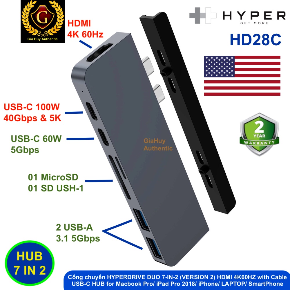Cổng chuyển HYPERDRIVE DUO 7-IN-2 (VERSION 2) HDMI 4K 60HZ với cáp USB-C HUB 100W PD Macbook Pro/ iPad / iPhone/ Laptop