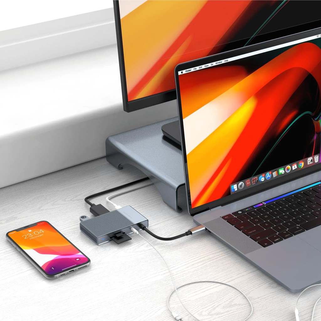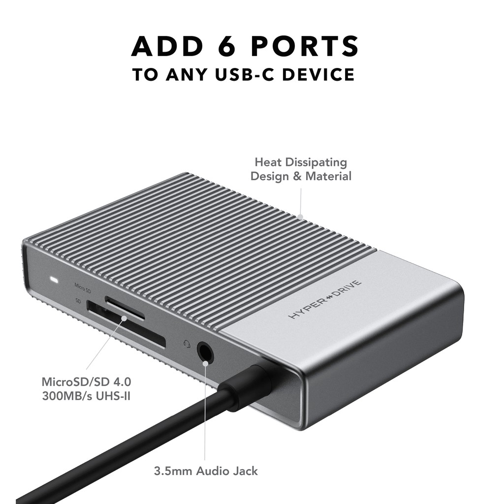 Biến một cổng USB-C duy nhất trên bất kỳ Macbook/Laptop/Máy tính bảng hoặc thiết bị di động nào thành bộ chuyển đổi đa cổng USB-C với 6 cổng: HDMI 4K60Hz, USB-A 10Gbps, MicroSD / SD UHS-II 312MB / s, USB-C Power Delivery 100W và Giắc cắm âm thanh 3,5 mm.
