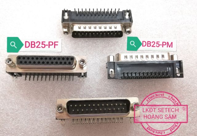 5. Cổng DB25-PF màu đen 25 chân vuông cắm board hàn mạch, 2 hàng chân, trên mặt có đánh số chân hàng trên từ phải sang 1,2,3,4,5,6,7,8,9,10,11,12,13; hàng dưới từ phải sang 14,15,16,17,18,19,20,21,22,23,24,25.
