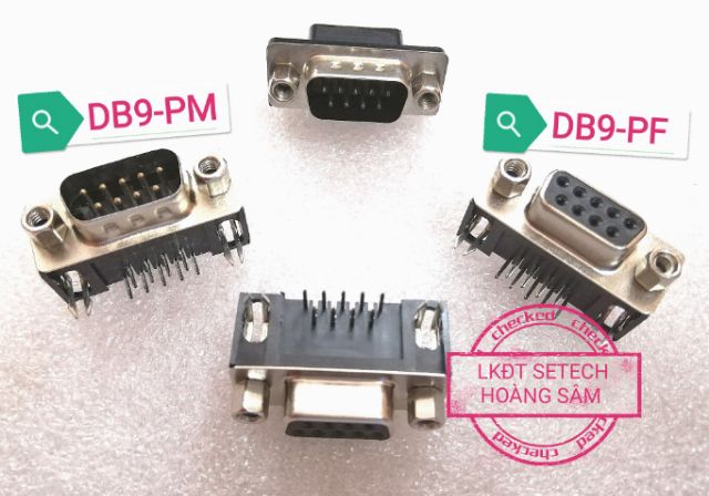 2. Cổng DB9-PM màu đen 9 chân vuông cắm board hàn mạch, 2 hàng chân, trên mặt có đánh số chân hàng trên từ trái sang 1,2,3,4,5; hàng dưới từ trái sang 6,7,8,9