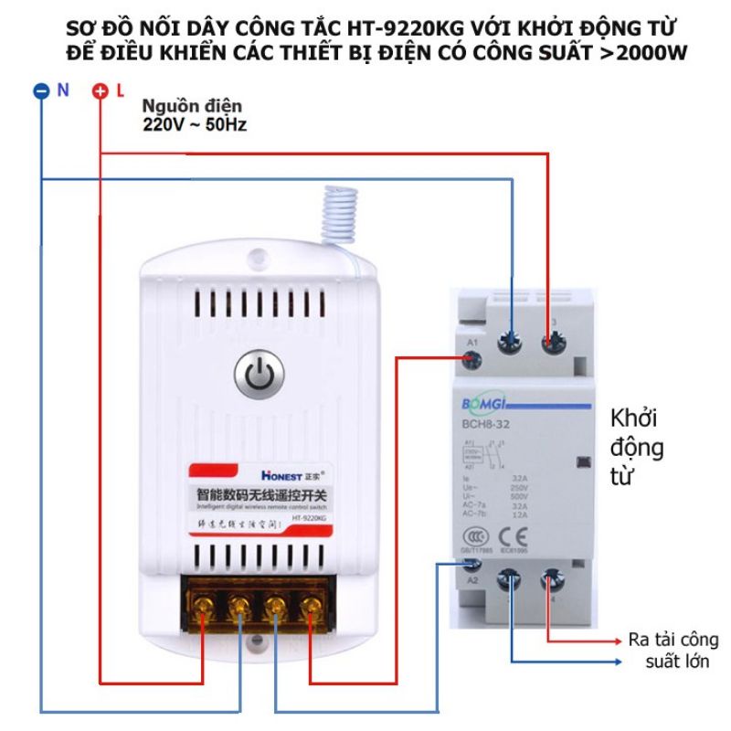 Bạn có thể sử dụng công tắc điều khiển từ xa Honest này để bật tắt máy bơm (2000w), bình nước nóng, các ứng dụng motor có dòng khởi động <30A…, các thiết bị tải trở công suất đến (5000w). Bạn muốn điều khiển cho máy công suất cao hơn hơn thì đấu qua khởi động từ nhé !