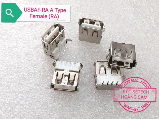 Cổng USB các loại dùng cắm / dán trên bo mạch điện:1. USBAF-RA: Type A Female (cổng cái) chân cong, 4 chân tín hiệu + 2 chân gá cố định.