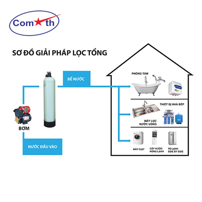 Cột lọc thô bao gồm vật liệu lọc' than hoạt tính, cát thạch anh, sỏi thạch anh, mangan và hạt nâng pH.Phụ kiện đi kèm. Van 3 ngã