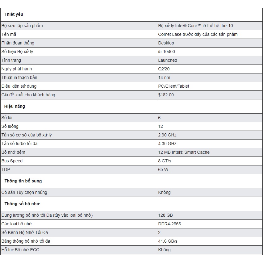 CPU Intel Core i5 10400 (2.9GHz turbo 4.3GHz | 6 nhân 12 luồng | 12MB Cache)