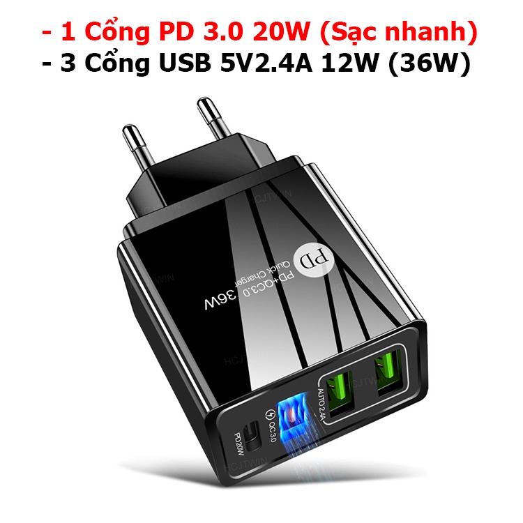 Củ sạc nhanh PD 20W iPhone Samsung 4 USB QC 3.0 PD 3.0 Type C