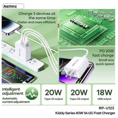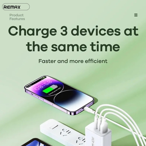 - 3 cổng (1 USB‑A, 2 USB‑C) giúp sạc đồng thời 3 thiết bị với tổng công suất 40 W