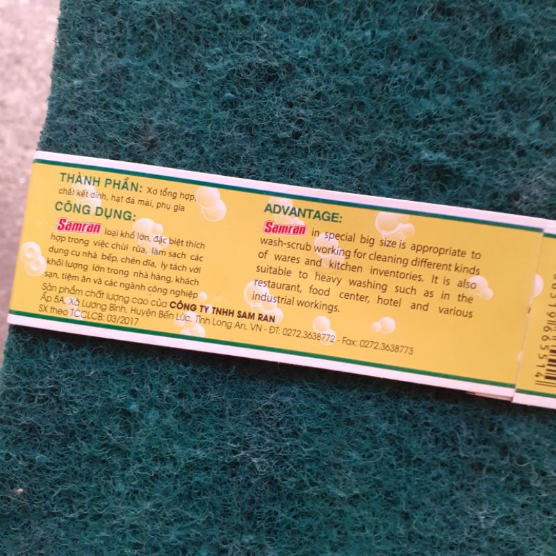 Thành phần: Xơ tổng hợp, acrylic-copylymer, hạt đá mài, phụ gia.-Công dụng: Cước xanh siêu sạch Samran loại cứng khổ lớn và không phai màu, rất thích hợp trong việc làm sạch bề mặt các vật liệu cứng như: kim loại, gốm, thủy tinh,...