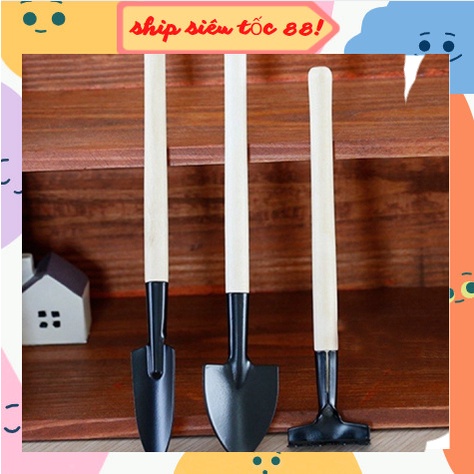 Bộ dụng cụ chăm sóc cây cảnh gồm: 1 xẻng lưỡi ngắn 21cm, 1 xẻng lưỡi dài 22cm và 1 cào đất 18cmChất liệu: Cán bằng gỗ, lưỡi bằng kim loại