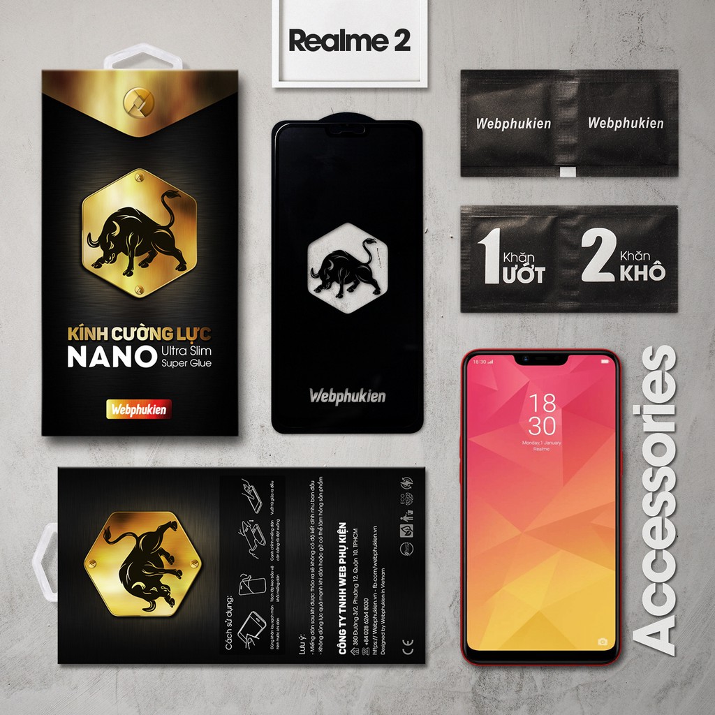 Miếng dán cường lực Realme 2 hiệu Webphukien Full trong suốt được chế tạo theo công nghệ quang học tiên tiến của Nhật bản, có độ bền cao, bảo vệ tuyệt đối cho máy của bạn.