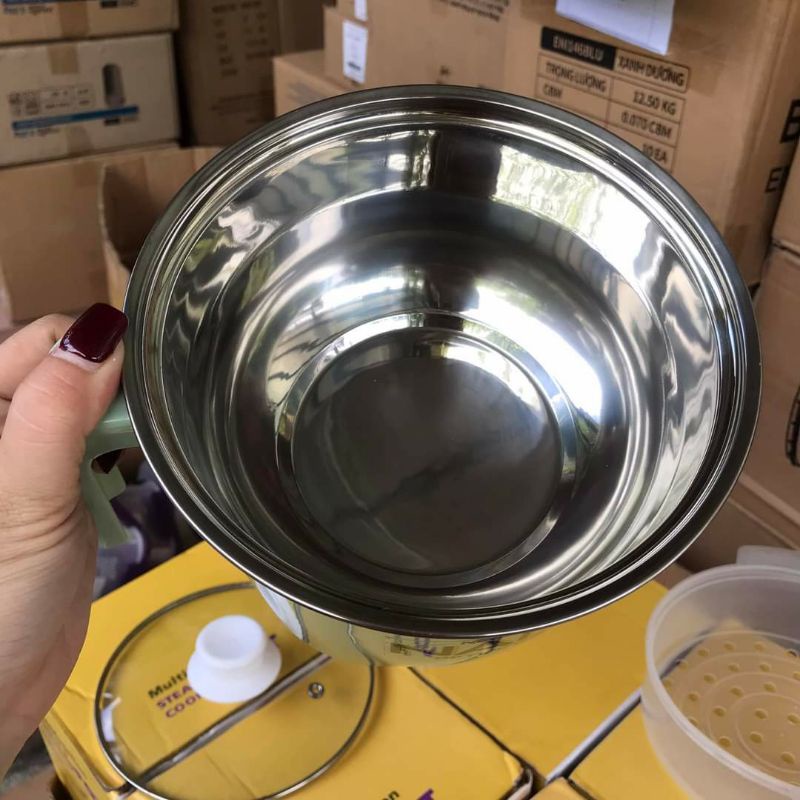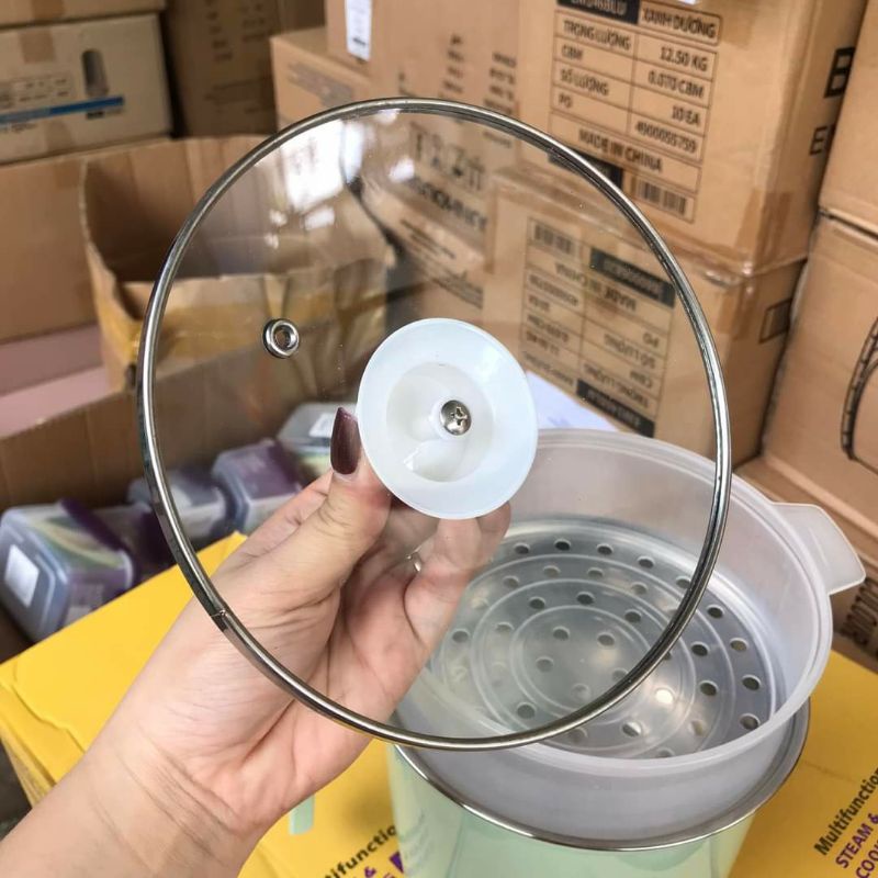 - Công dụng: Nấu canh, cháo, xào, nấu lẩu, nấu mì,… Có kèm xửng hấp nhựa tiện lợi.