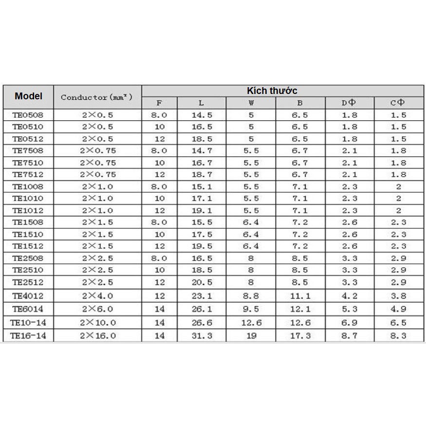 - Đầu cos pin rỗng đôi TE0508 ~ TE10-14- Đầu cos sử dụng cho 2 dây dẫn vào chung 1 cos phù hợp cho các vị trí cần kẹp đôi dây