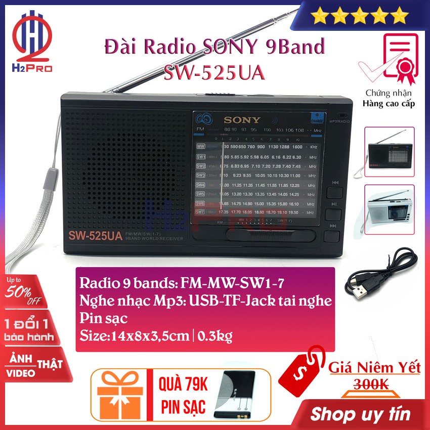Đài radio FM Sony SW-525UA H2Pro 9 Bands Quốc tế FM, MW, SW1-7, đài radio sạc điện, có USB-Thẻ nhớ làm máy nghe nhạc mp3 (tặng pin sạc và dây sạc 79K)Đài FM Sony SW-525UA bắt được 9 tần số FM/MW/SW1-7, hỗ trợ USB/thẻ nhớ, jack 3.5 kết nối điện thoại, và thiết bị âm thanh khác. Đài fm sử dụng pin sạc điện nokia, dễ dàng mang theo bên mình nhờ vào tay cầm chắc chắn như máy nghe nhạc. Đài radio SW-525UA đang được Thế giới công nghệ H2Pro phân phối và bán lẻ, giao hàng toàn quốc.
