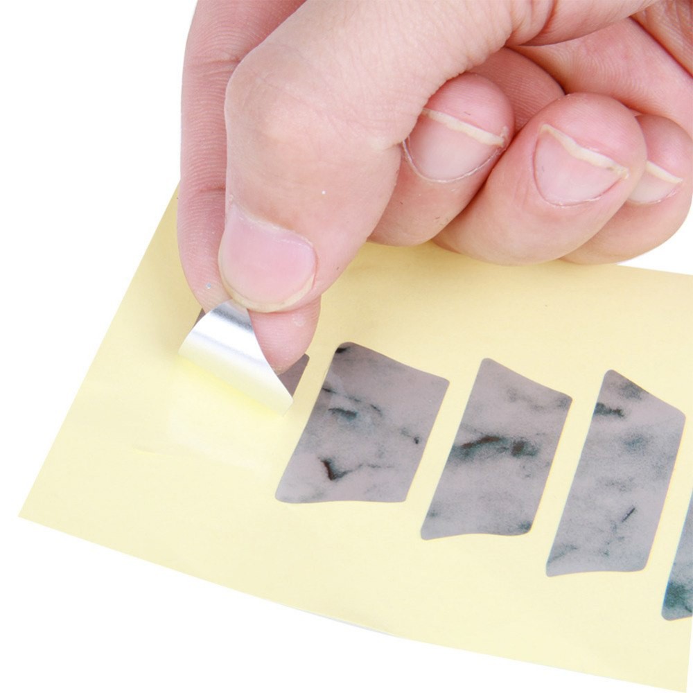 * Bóc từng miếng sticker inlay và dán lên vị trí đã ướm (có thể dùng nhíp cho dễ dàng và chính xác)