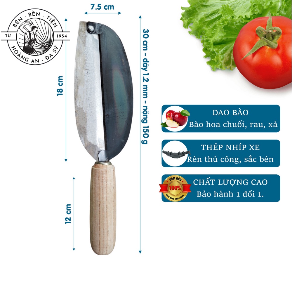 Dao dùng thái hoa chuối, bào rau. * Lợi ích khi dùng dao của HOÀNG AN - ĐA SỸ. - BÉN: Dao được rèn bởi nghệ nhân của làng nghề Đa Sỹ nên đảm bảo được độ bén và bền của lưỡi dao (6 tháng -1 năm mới phải mài lại 1 lần) - BỀN: Lưỡi dao được làm từ thép của nhíp xe oto nên độ bền bỉ với thời gian. - TIỆN: Cán dao được làm bằng gỗ và độ vát của cán được chúng tôi đúc kết qua nhiều năm sản xuất -> dễ cầm nắm và sử dụng. * Chất liệu - Lưỡi dao làm bằng thép của nhíp xe oto. - Cán dao: được làm bằng gỗ tự nhiên. * Kích thước: - Dài tổng: 30 cm - Rộng: 7.6 cm - Dài của lưỡi: 18 cm - Cán dao: 12 cm - Dày: 1.2 cm - Cân nặng: 150 gram #daonhabep #daothaithit #daothai #daothairau #daothaica #daodasy #daocatthit #daothaithitdonglanh #daocatthitdonglanh #daoxatthit #daothaichuoi #daobaorauGiá autism