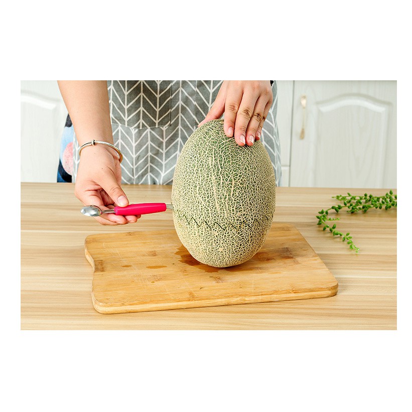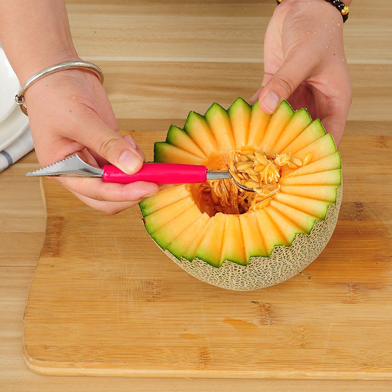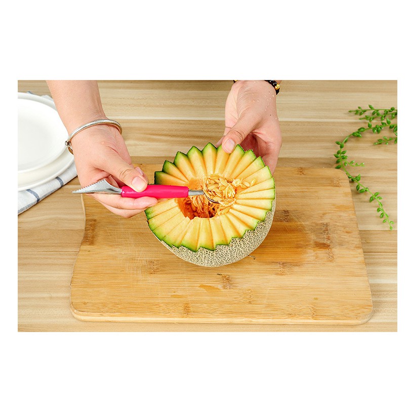 Dụng cụ cắt tỉa hoa quả 2 đầu:- Cấu tạo: gồm 2 đầu: 1 đầu là dao nhọn, lưỡi răng cưa, bằng inox, dùng tỉa các loại hoa quả như dưa hấu, dưa vàng, cam...; 1 đầu là muôi múc inox dùng múc hoa quả