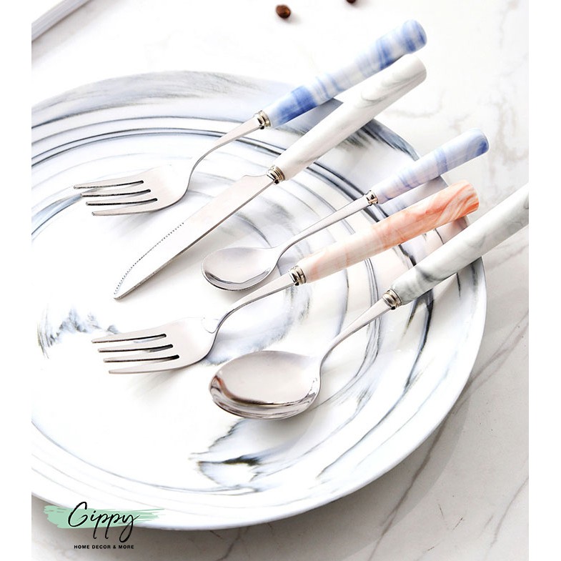 Nhà cửa & Đời sống > Bộ đồ bàn ăn > Bộ dao kéo || Bộ dao thìa dĩa bạc chuôi marble - Gippy DecorCòn hàng