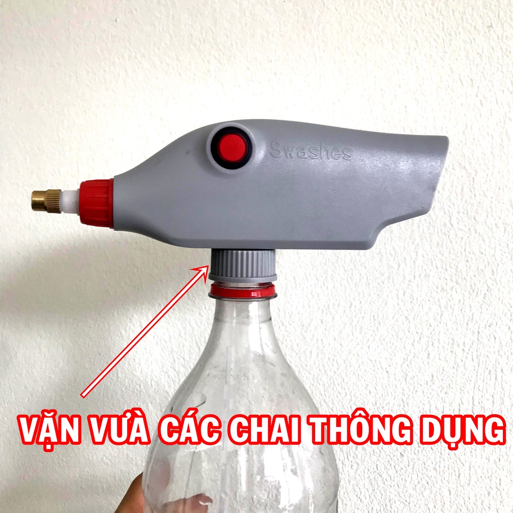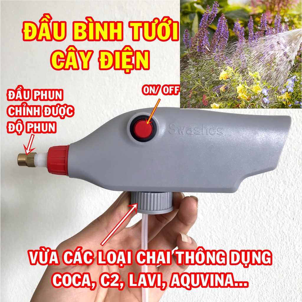 Sản phẩm là đầu bình tưới cây chạy điện. Chưa có bình chứa nước- Đầu vặn phù hợp với các loại chai nước ngọt, nước khoáng thông dụng.