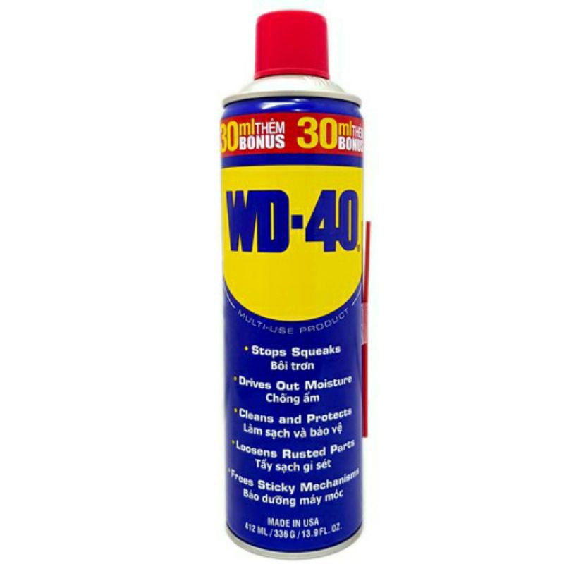 DẦU CHỐNG RỈ SÉT ĐA NĂNG WD-40 412ML- Dầu chống rỉ đa năng WD-40 là sản phẩm dầu chống rỉ sét công nghệ cao hàng đầu của Mỹ, được sử dụng rộng rãi trong ngành công nghiệp dầu-khí, quân đội, hàng hải, nhà xưởng, khu công nghiệp, phương tiện vận chuyển, viện nghiên cứu, nhà máy, gia đình, v.v...