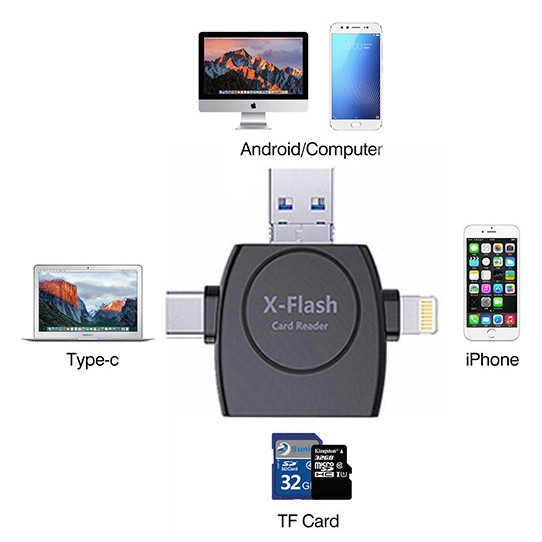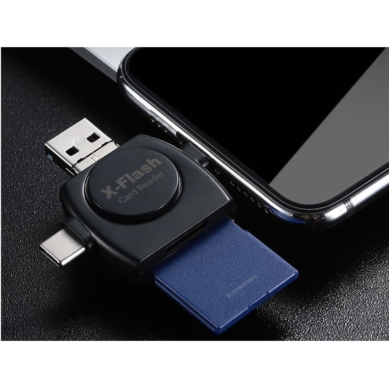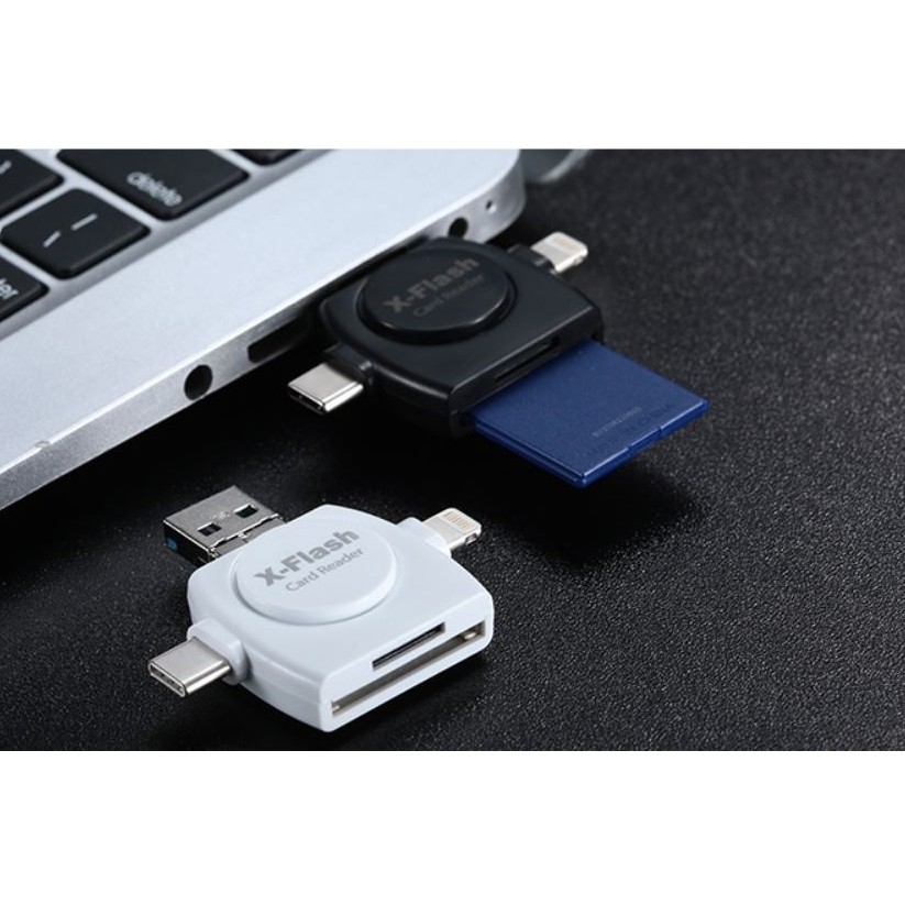 Đầu đọc thẻ đa năng X - Flash Card Reader.Đầu đọc thẻ nhớ đa năng x-flash dành cho các cổng lightning, micro usb, type-c, usb. Bộ đầu đọc thẻ nhớ đa năng đọc thẻ micro sd của điện thoại và thẻ SD của máy ảnh. Đầu đọc thẻ nhớ x-flash có 4 đầu cắm kết nối với nhiều thiết bị khác nhau để dễ dàng chuyển đổi hình ảnh, dự liệu 1 cách nhanh chóng giữa các thiết bị với nhau.