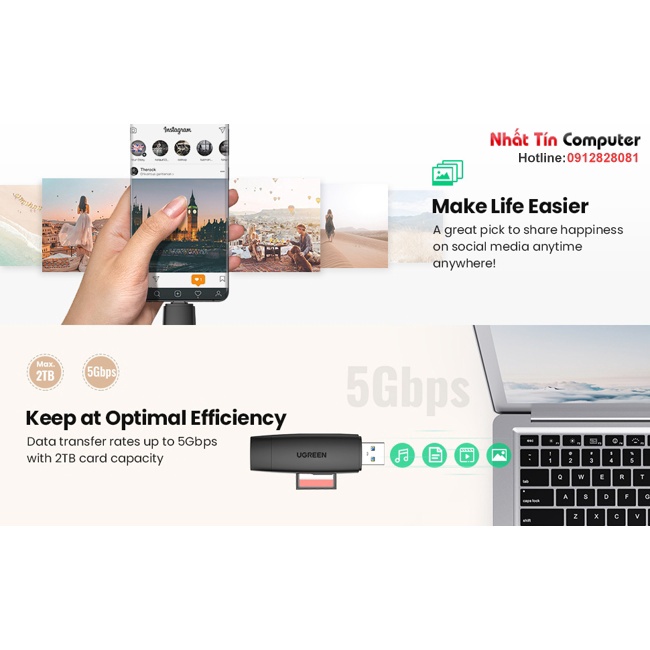 Đầu đọc thẻ SD/TF nhỏ gọn Ugreen 80191 này dễ dàng truyền / sao chép / phát lại ảnh du lịch của bạn sang điện thoại hoặc máy tính bảng hỗ trợ USB-C OTG, chia sẻ ảnh của bạn trên Facebook hoặc các phương tiện truyền thông xã hội khác ngay lập tức.