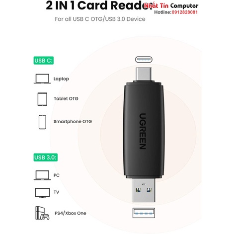 Đầu đọc thẻ nhớ SD/TF 2 trong 1 USB-A & USB-C Ugreen 80191Đầu đọc thẻ Ugreen 80191 này ngoài sự kết hợp của USB 3.0 và Đầu cắm USB Loại C, tương thích với hầu hết các thiết bị USB-A và Thiết bị USB-C, chẳng hạn như PS4 / PS3, Xbox One, PC, Máy tính xách tay, điện thoại thông minh hỗ trợ USB-C và máy tính bảng, không cần cài đặt trình điều khiển cho Windows 10 / 8.1 / 8/7 / XP / Vista, macOS, Chrome, Linux, Android, iPadOS.