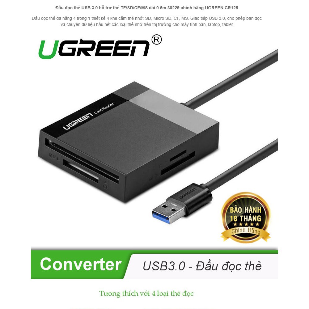 Máy tính & Laptop > Phụ Kiện Máy Tính > Bộ chia cổng USB & Đọc thẻ nhớ || Đầu đọc thẻ nhớ SD-TF-CF-MS Ugreen 30229 chuẩn USB 3.0Còn hàng