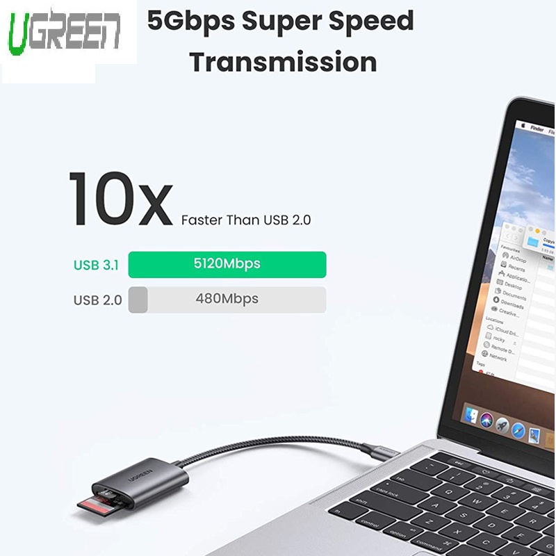 Đầu đọc thẻ Ugreen 80888 hỗ trợ đọc thẻ SD/TF cho máy tính, điện thoại di động có cổng USB Type C kết nối truyền tải dữ liệu hình ảnh, video