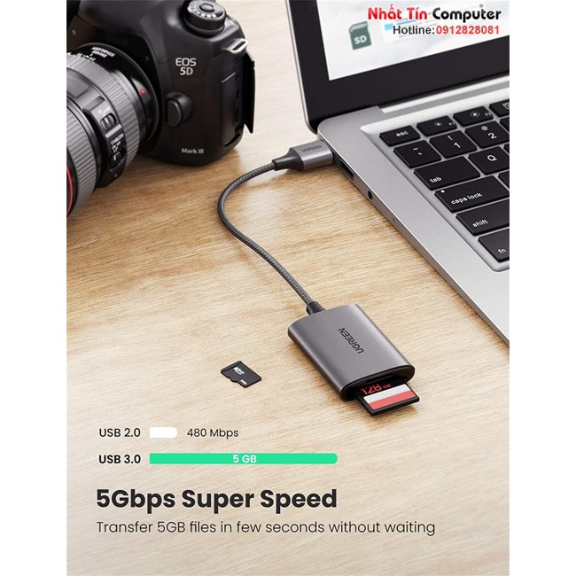 Đầu đọc thẻ SD/TF Ugreen 80887/80888 vỏ nhôm cao cấpTruyền dữ liệu tốc độ cao 5Gbps: Đầu đọc thẻ nhớ Ugreen hỗ trợ truyền dữ liệu lên đến 5Gbps, nhanh hơn 10 lần so với USB 2.0 (480Mbps), cho phép bạn truyền một bộ phim HD hoặc các tệp tin trong vài giây và nó cũng có thể quay ngược trở lại với USB 2.0 và USB 1.1. Hỗ trợ dung lượng thẻ nhớ lên đến 2TB, chia sẻ niềm hạnh phúc của bạn trên mạng xã hội chỉ trong vài giây thông qua đầu đọc thẻ.