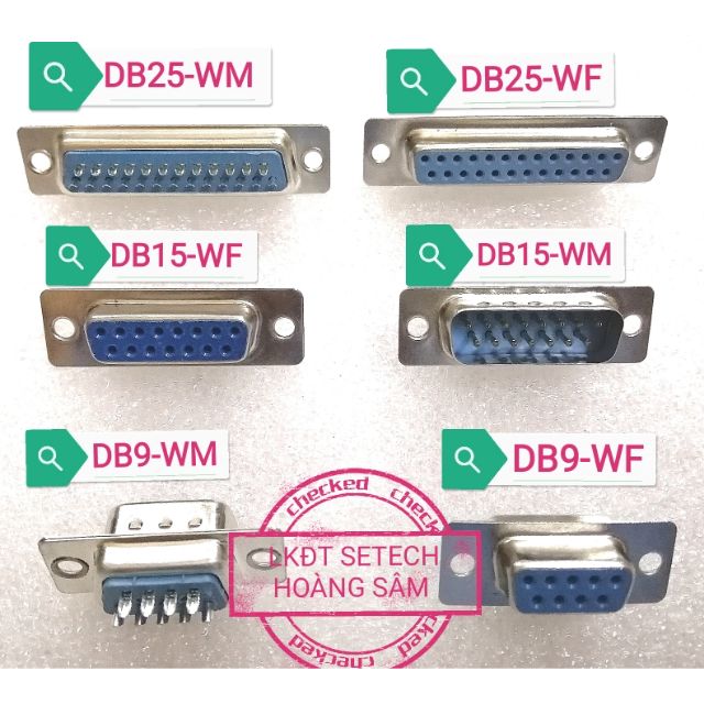 Đầu DSUB DB9 DB15 DB25 màu xanh các loại nối dây:1. DB9-WM: Đầu DB9 nối dây, 2 hàng chân, mặt xanh chân kim đực, trên mặt có đánh số chân hàng trên từ trái sang 1,2,3,4,5; hàng dưới từ trái sang 6,7,8,9.