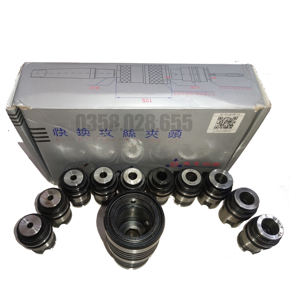 - Bộ L0622B22: Gồm 1 cán và 9 collet cặp taro M6, M8, M10, M12, M14, M16, M18, M20, M22 chuẩn JIS.