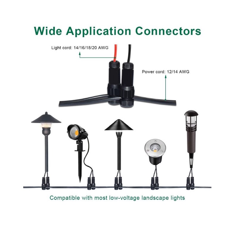 ĐẦU NỐI DIỆN TRANG TRÍ CẢNH QUAN, SÂN VƯỜN/ĐIỆN ÁP THẤP- Không cần phải cắt nối dây điện hay mua những chiếc nối, chia dây điện tốn kém. Bạn có thể sử dụng đầu nối này để thiết lập hệ thống đèn chiếu sáng trong nhà, sân vườn, quán hàng ngoài trời, thiết kế hệ thống đèn chiếu sáng, đèn trang trí...