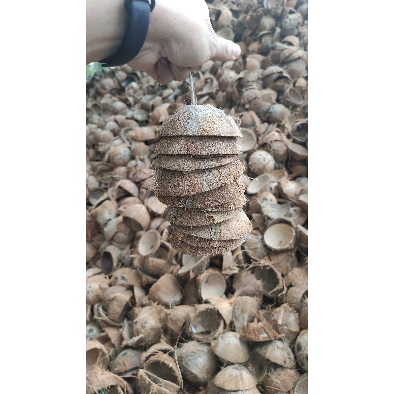 Dây gồm 10 miếng gáo dừa được cắt ra từ phía đầu mỗi quả dừa.Kích thước đường kính tầm 5-7cm, vui lòng bỏ qua 1-2cm chênh lệch với thực tế.